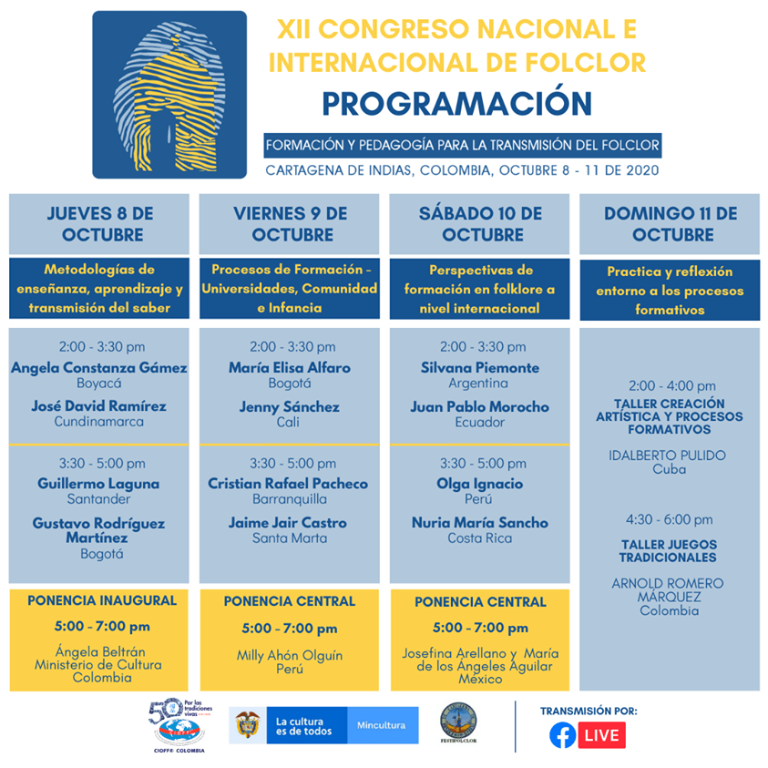 Del 8 al 11 de octubre de 2020 se llevó a cabo de forma virtual el “XII Congreso Nacional e Internacional de Folclor. Formación y Pedagogía para la transmisión del Folklor” organizado por CIOFF ® Colombia desde la ciudad de Cartagena de Indias. El encuentro contó con 7 paneles cuyas temáticas giraban alrededor de los procesos formativos y pedagógicos en torno a la Danza Folklórica.