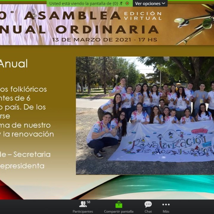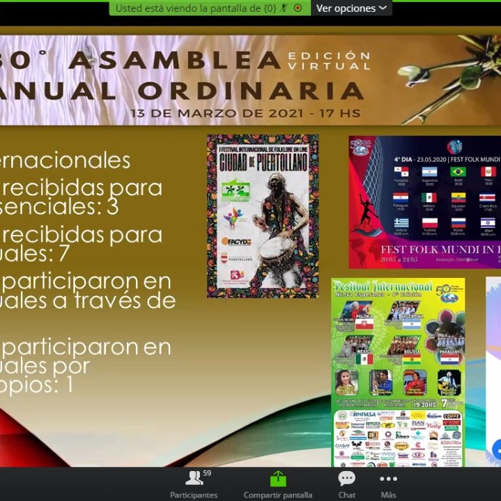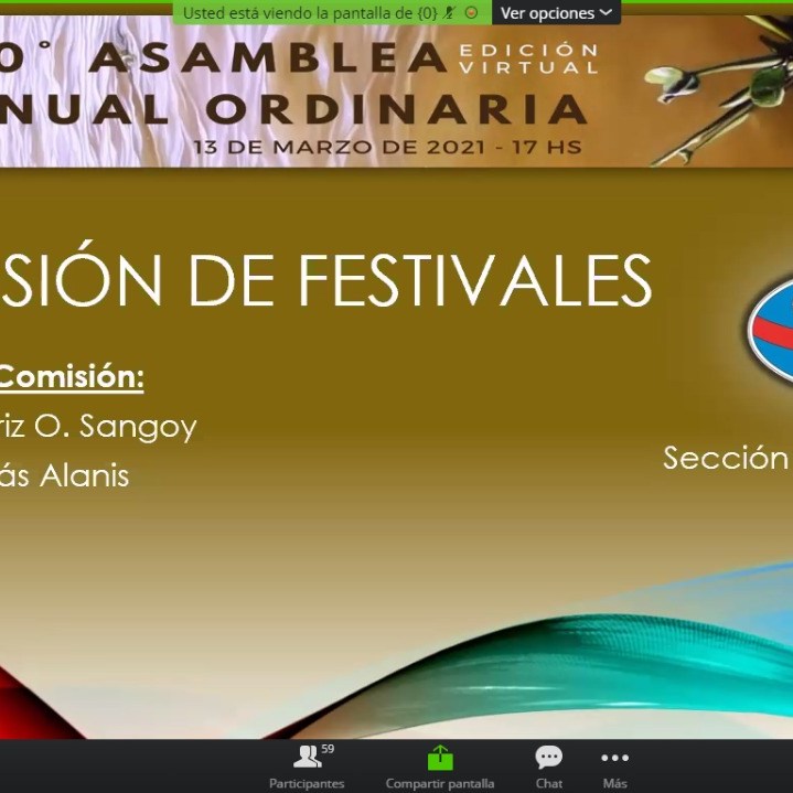 Esta nueva modalidad de encuentro, implicó la revisión de la infraestructura y la programación para posibilitar la realización del evento, propiciando de la mejor manera la participación de todos los asociados. La misma se implementó tanto para llevar adelante las reuniones de comisiones (Cultura, Jóvenes, Festival y Directores de Grupo), quienes tuvieron su espacio de trabajo el pasado sábado 6 de marzo, así como también la realización misma de la Asamblea.
