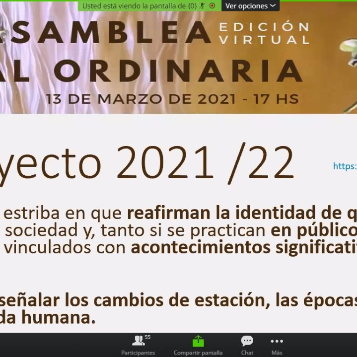 Por su parte, las comisiones de Cultura y Directores de Grupo sesionaron juntas. Asistieron directores de los grupos asociados ordinarios y observadores, también se contó con la participación de miembros plenos. Se habló sobre la intervención de grupos de manera virtual en distintos festivales, y se detalló que el nivel de invitaciones a estos eventos fue decreciendo considerablemente hacía la segunda mitad del año. Se puntualizó en la necesidad de que los grupos consideren hacer registros de video, en buena calidad de imagen y sonido, para aprovechar este nuevo modo de encuentros que se ha inaugurado. En esta reunión, la Presidenta de la Comisión de Cultura, desarrolló los ejes principales de los tres proyectos del año que pasó, que fueron la base de datos «Saberes Culturales», el proyecto colaborativo de investigación «Portadores de Patrimonio Cultural Inmaterial: Los artesanos» y la postulación en Puntos de Cultura con el proyecto del Museo del Traje “Vestir Identidades”. También invitó a los participantes a agendar la fecha del Foro Cultural 2021 que se realizará en forma virtual el 10 de abril a las 17 hs y se debatió acerca del proyecto de investigación 2021 llamado «Calendario de Celebraciones»