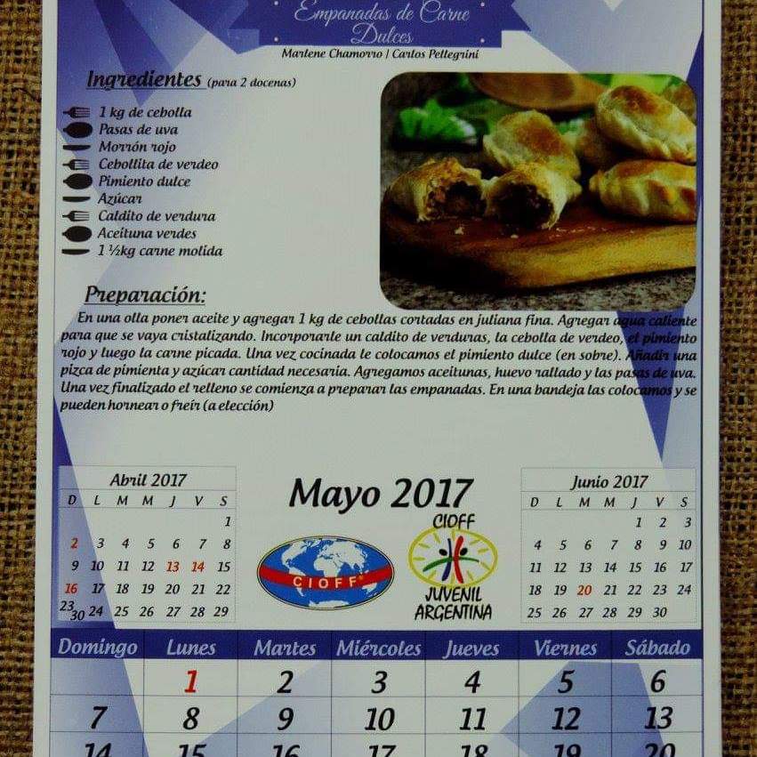 En el ritual de cocinar se materializa el amor de quién amasa, corta, prepara, pela, hornea, cocina para la familia, comunidad y los amigos. Las recetas tradicionales encierran en su esencia los sabores del pueblo, los aromas y colores de la cultura y la transmisión oral e intergeneracional de padres y abuelos a sus hijos. Es por ello que la Comisión de Jóvenes de CIOFF® Argentina quiso realizar este trabajo de rescate de recetas y compartirlas con ustedes a través de este calendario. Los grupos de jóvenes que participaron para esta producción: Santa Fe, Carlos Pellegrini, Crespo, Villaguay, Las Parejas, Las Rosas, Pirané, Brinkmann y Helvecia. -Edición: Facundo Gaztelú y Anahí Main.