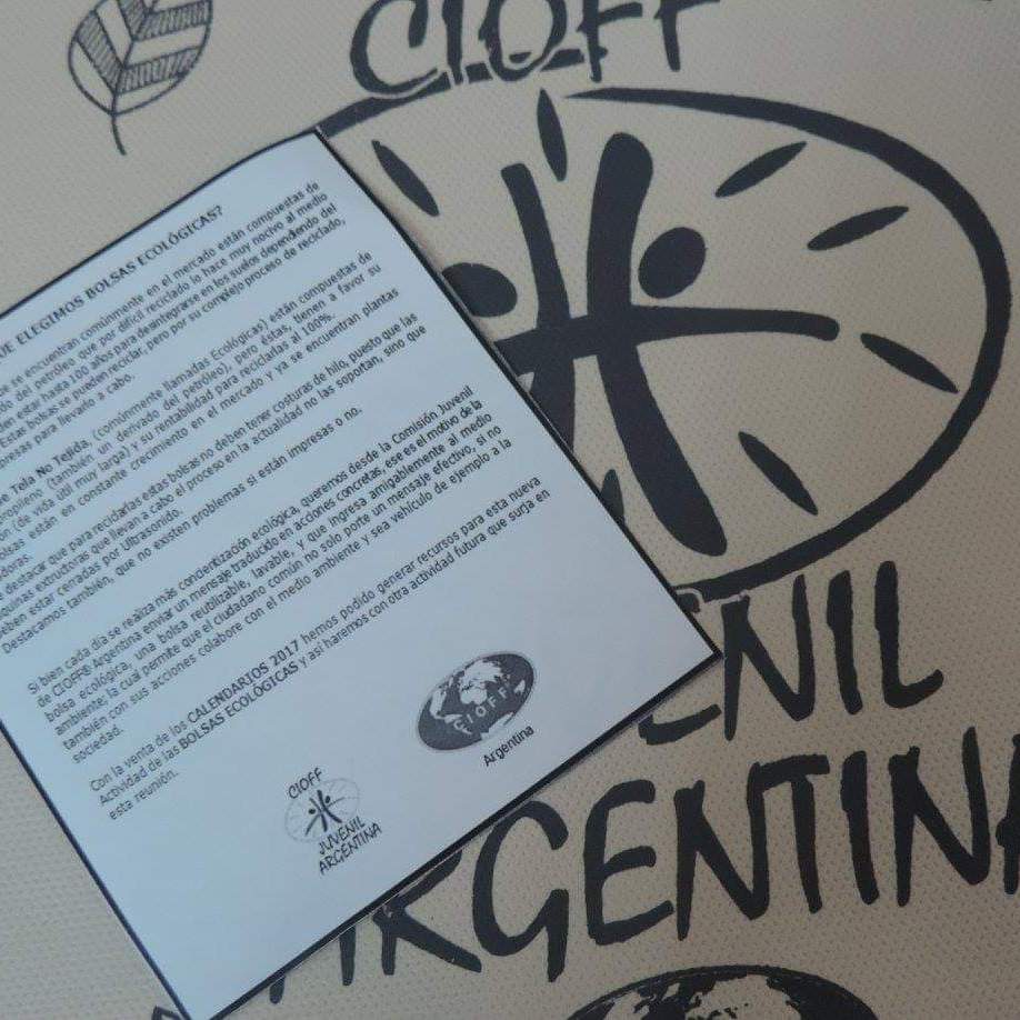 Si bien cada día se realiza más concientización ecológica, desde la Comisión Juvenil de CIOFF® Argentina quisimos enviar un mensaje traducido en acciones concretas, ese es el motivo de la bolsa ecológica, reutilizable, lavable, y que ingresa amigablemente al medio ambiente. El diseño fue realizado por jóvenes de la Comisión y las bolsas se vendieron en diferentes localidades del país en donde está presente el CIOFF Juvenil, las recaudaciones se destinan a financiar futuras actividades.